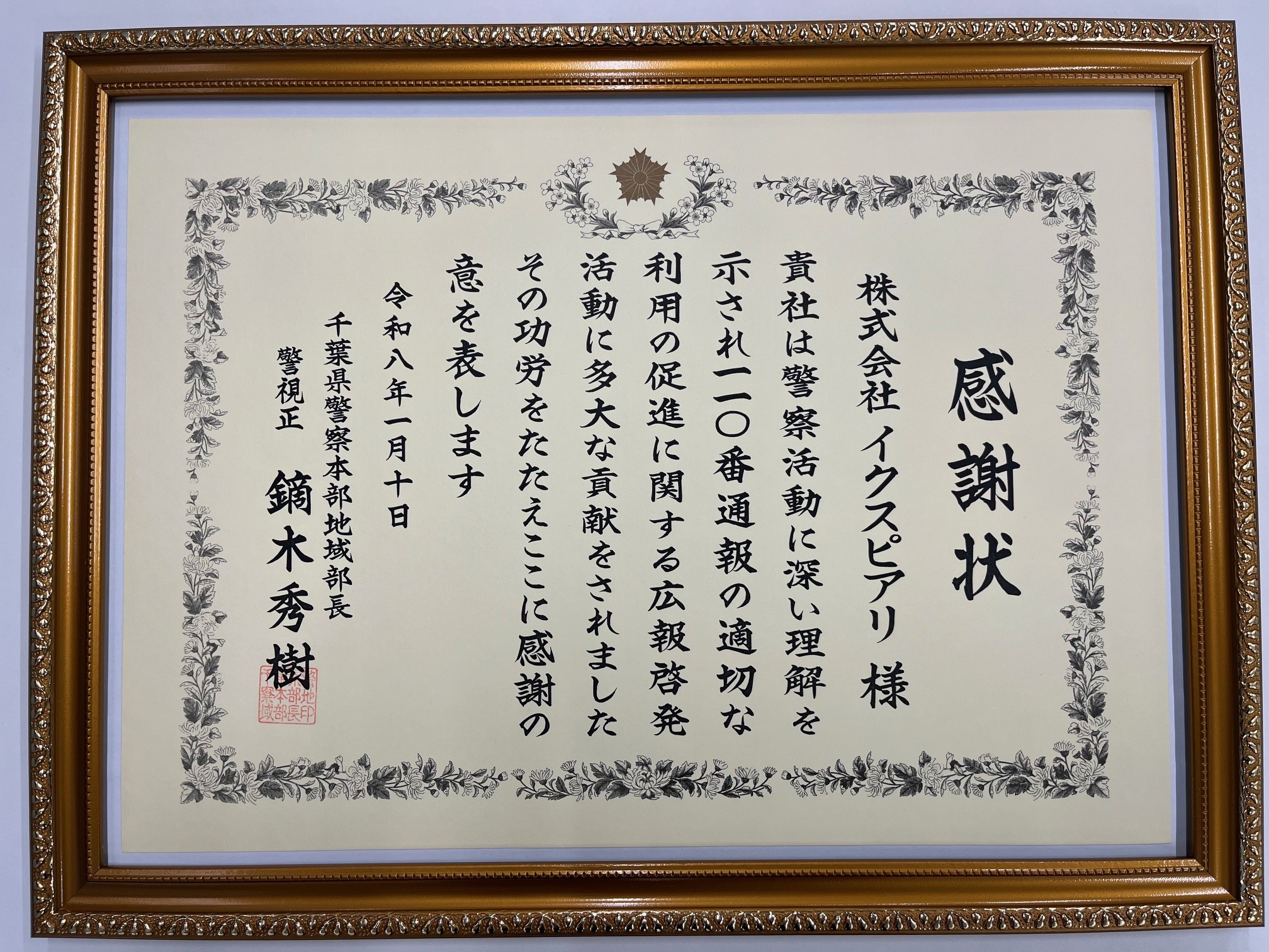 本イベントでの110番通報制度の啓発や、そのほか警察運営に対する協力への功労が認められ、千葉県警察本部地域部長より株式会社イクスピアリへ感謝状が授与されました。